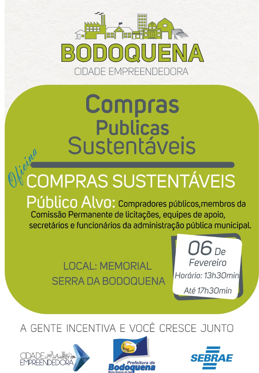 A Prefeitura Municipal de Bodoquena, por meio da Secretaria de Turismo, Cultura, Meio Ambiente e Desenvolvimento Econômico, em parceria com o Sebrae/MS, realizam dia 6 de fevereiro, quarta-feira, a Oficina de compras sustentáveis, das 13h30 às 17h30, no Memorial Mário Brother, localizado na Secretaria de Turismo.